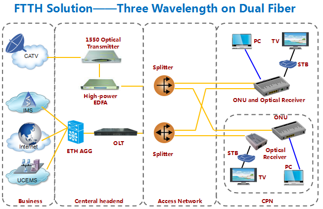 GPON: Uplink transmission rate:1.25GBPS Downlink l transmission rate:2.5GBPS EPON: Uplink transmission rate:1.25GBPS Downlink l transmission rate:1.25GBPS Network coverage radius : 20 km Optical interface type:SC/PC or SC/APC Optical receiver with high sensitivity : ≥-28dBm Luminous power:1~4dBm |